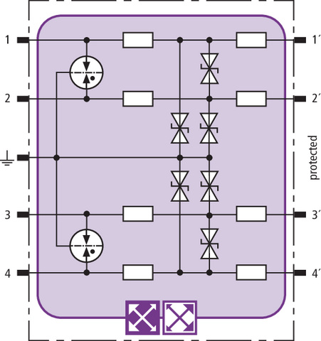 Platzsparendes Kombiableiter-Modul mit LifeCheck zum Schutz von 2 Doppeladern symmetrischer Schnittstellen mit Eingangs-Diodenschutzbeschaltung, Stromschleifen (TTY) und Optokoppler-Eingängen. LifeCheck erkennt thermische oder elektrische Überlastzustände nach denen der Ableiter auszutauschen ist. Die Anzeige erfolgt berührungslos mittels DEHNrecord LC / SCM / MCM.