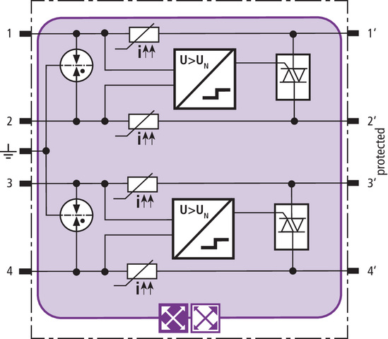 Platzsparendes Kombiableiter-Modul mit actiVsense-Technologie mit RFID-LifeCheck zum Schutz von 2 Doppeladern mit gleicher oder auch unterschiedlicher Betriebsspannung symmetrischer Schnittstellen mit galvanischer Trennung. Erkennt automatisch die anliegende Betriebsspannung des Nutzsignals und passt den Schutzpegel optimal an diese an.